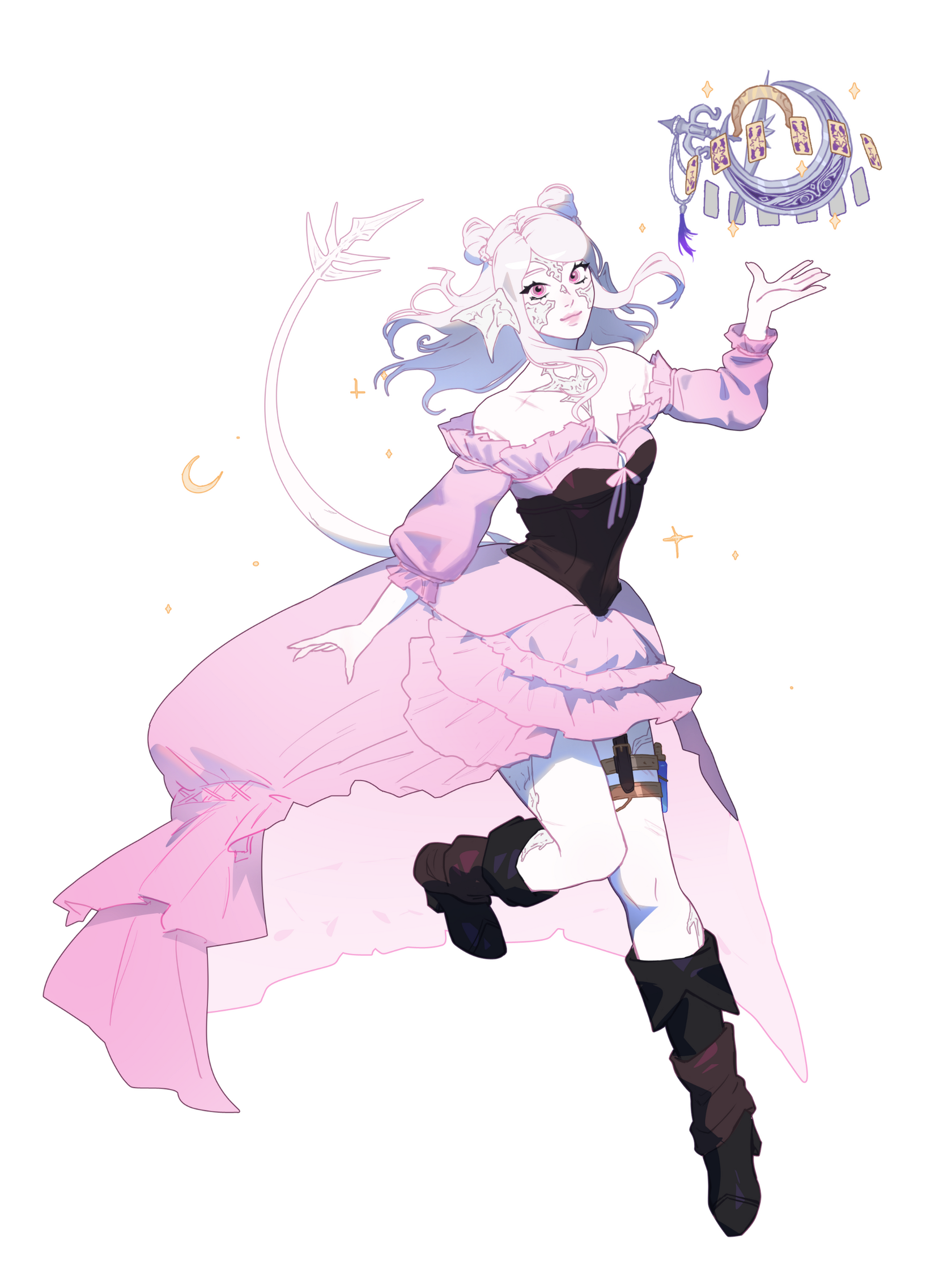 Only just having gotten a chance to really start experimenting with fashion, Astraea loves to wear a wide variety of things. She tends to favor pastel colors (especially pinks) or monochromes (whites and blacks, not really grays), and prefers clothing that gives her extra senses of movement. Shoes are a huge centerpiece of hers, and she loves thigh or knee high boots - heeled, sometimes, even in impractical situations (where she is otherwise surprisingly meticulous about the practicality of her wardrobe). It is often pointed out to her that she tends to not wear pants vs skirts or MAYBE shorts, but…eh. She has nice legs, right? She also has a tendency to accessorize with flowers in her hair, or occasionally a very small or very large hat.